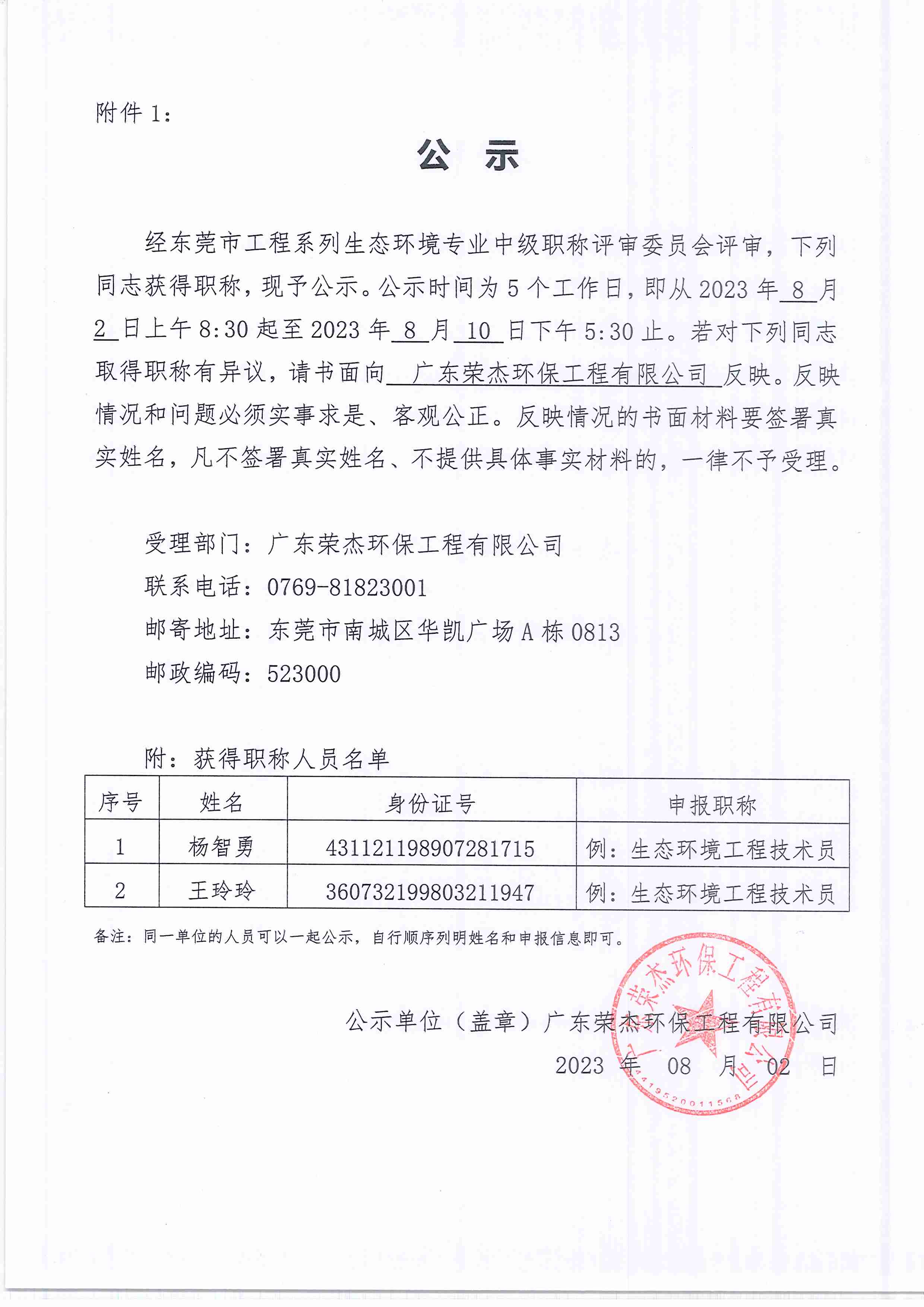 经东莞市工程系列生态环境专业中级职称评审委员会评审,下列同志获得职称,现予公示。公示时间2023年8月2日-2023年8月10日。